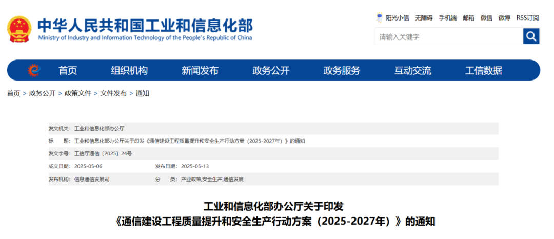 为进一步夯实通信建设工程安全生产工作基础,持续提升通信建设工程质量,工业和信息化部近日印发《通信建设工程质量提升和安全生产行动方案(2025—2027年)》。《行动方案》坚持系统谋划、依法合规、问题导向、协同推进原则,主动适应通信建设领域发展新形势,从6个方面提出了16项任务。